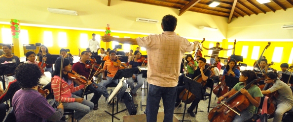 This is just one example of what Roberto does – and can do.  He is the archetypal núcleo director, combining the best elements of performer, teacher and administrator. More than that, as the single-day relocation demonstrates, he’s a man who gets things done.  The first time I met him was in Boston, in the first week of the Abreu Fellows program. His first act was to induct the Fellows into the Fesnojiv family through the presentation of the insignia of the movement. We then watched over an hour of footage from various concerts, some featuring him as soloist (he’s an active cellist, trained in both Venezuela and Europe, and was a member of the forerunner of the Símon Bolívar Orchestra), some featuring him as a conductor. I don’t want to give the impression that the session was about him – it was always about el Sistema, about the work of the organization, and he demonstrated it as best he could: through the music.