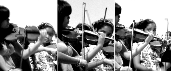 I took the pictures above at a rehearsal of the new youth orchestra for children under the age of 16, during my visit to Caracas in early July. This young woman was surely one of the youngest, if not the youngest musician in the orchestra: feet barely able to reach the floor, eyes barely able to see over the music stand in front of her to Sir Simon Rattle on the podium. Every few measures she would sneak a furtive peek over at her stand partner, several years her senior but her superior only in age, not ability. Sometimes it was to verify the position of the bow on the strings, other times to double-check the timing of an entry.
