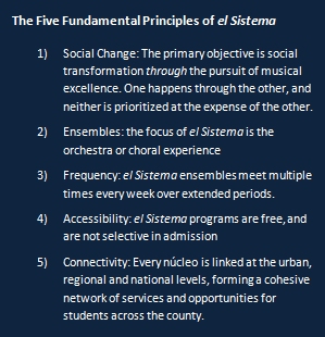 When first proposed, the Five Fundamentals were an attempt to differentiate el Sistema from the conservatory-style approach of music education on a purely structural or organizational level. They did so relatively successfully, given the current level of international adoption, but the social element therein was communicated largely by intention, via the first Fundamental, rather than specific action. Remove both intention and music and the Five Fundamentals may well describe the average public school system.